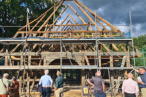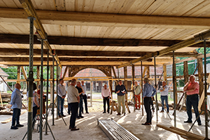 Die Baustellenführung durch das Haus Linden übernahm Museumsleiter Dr. Ulrich Brohm. Das Fachwerkhaus „Linden“ ist ein Vierständerbau von 1820, welches als Wohnstallhaus konzipiert ist, und die Hofstelle der Baugruppe „Linden“ auf dem Musemsgelände komplettieren soll. Derzeit befindet sich das Gebäude im Wiederaufbau und feierte erst kürzlich anlässlich des 50. Jubiläums des Museumsdorfes Hösseringen Richtfest.